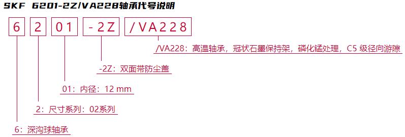 后綴列表:【-2Z:雙面帶防塵蓋】【/VA228:高溫軸承,冠狀石墨保持架,磷化錳處理,C5 級徑向游隙】。