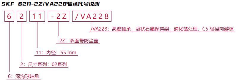 后綴列表:【-2Z:雙面帶防塵蓋】【/VA228:高溫軸承,冠狀石墨保持架,磷化錳處理,C5 級徑向游隙】。