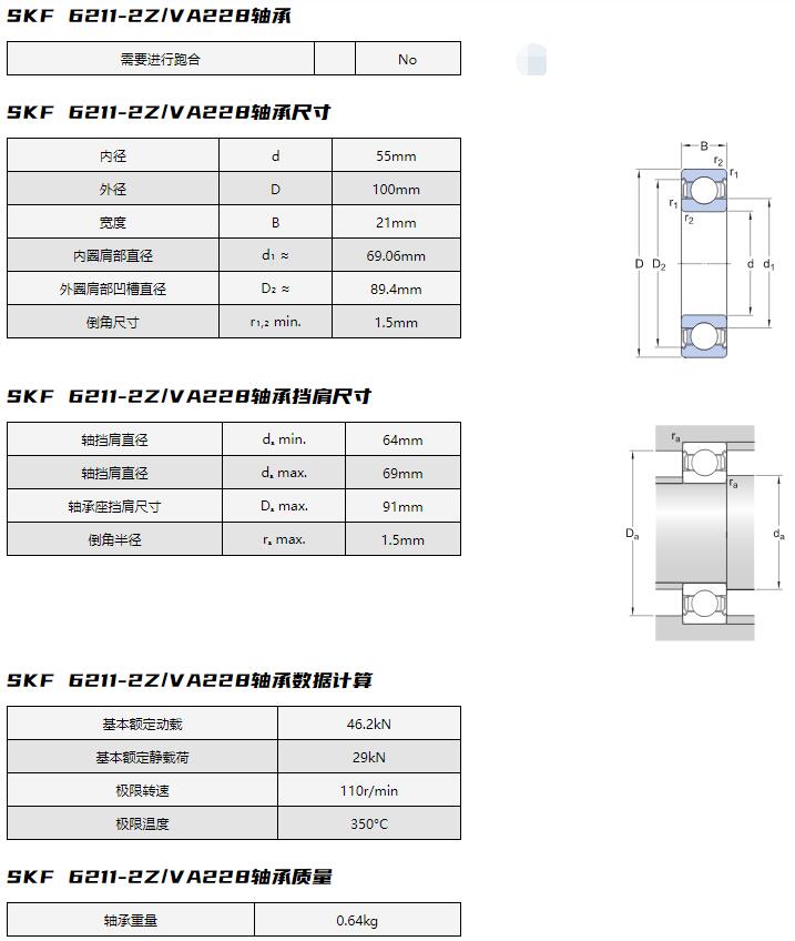 SKF 6211-2Z/VA228軸承屬于用于高溫應(yīng)用場合的單列深溝球軸承,需要進(jìn)行跑合:No?!究商鎿Q的NTN軸承為:NTN 6211F604軸承】